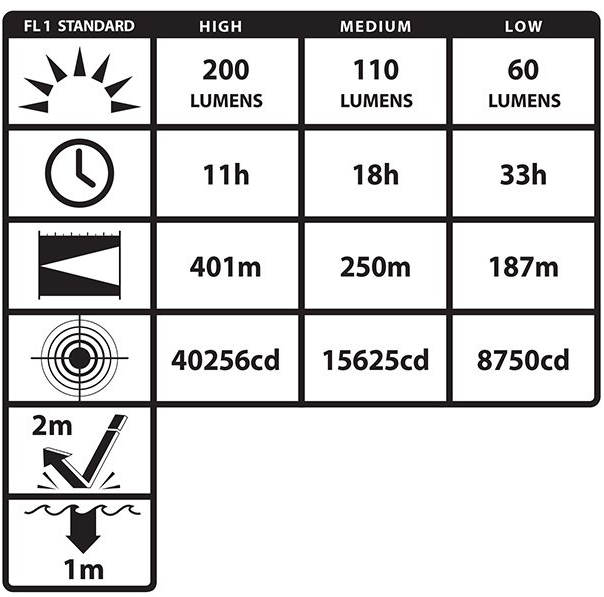 - Główna dioda światła strumienia skupionego może pracować w jednym z 3 wybieralnych trybów mocy: 200, 110 i 60 lumenów. Jej zasięg wynosi do 401 m. Światło skupione idealnie nadaje się do pracy w zadymieniu oraz podczas poszukiwań, a także oświetlania obiektów znacznie oddalonych. Dodatkowo dioda światła skupionego posiada możliwość przełączenia jej w tryb pracy stroboskopowej.