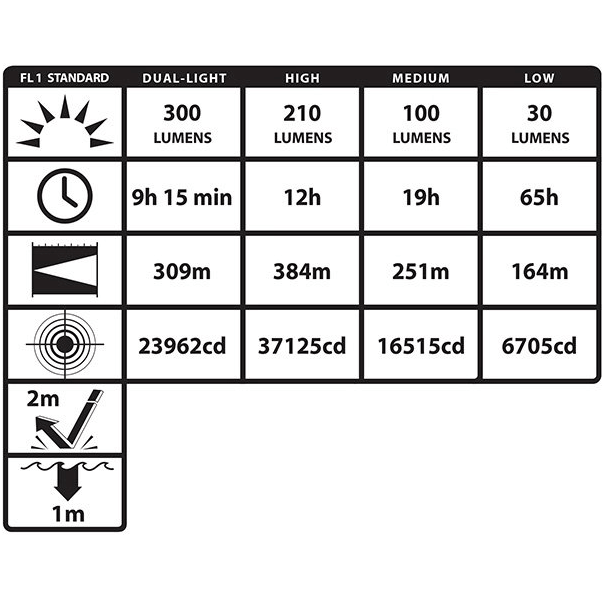 - Moc światła w lumenach: światło skupione wysoki – 210, średni – 100, niski – 30, światło rozproszone wysoki – 210, średni – 100, survival – 30, Dual-Light® - 300
