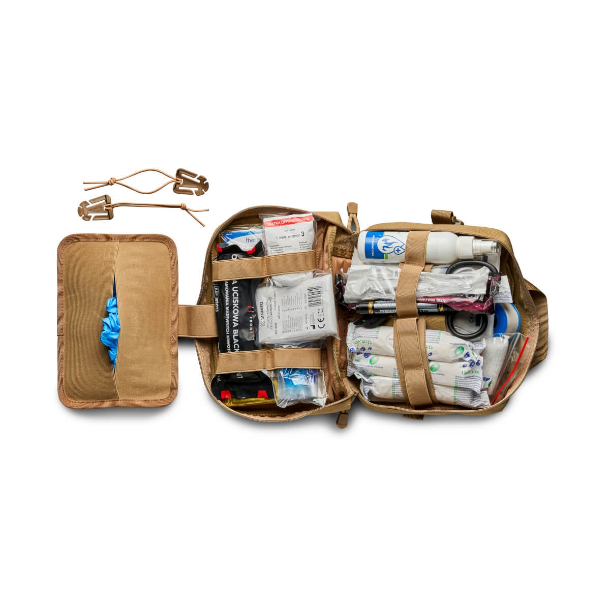 Saszetka Trauma Responder (TR) to futerał zaprojektowany na rozbudowane apteczki pierwszej pomocy, wyposażone w produkty medyczne gotowe do użycia względem większej ilości osób. Mimo niewielkich rozmiarów, produkt jest bardzo kompaktowy i mieści dużą ilość wyposażenia, co sprawia, że stanowi ciekawą alternatywę dla podręcznych toreb opatrunkowych. Konstrukcja zapewnia natychmiastowy i intuicyjny dostęp do całego wyposażenia. W środku można znaleźć wiele kieszeni dedykowanych na opatrunki, liczne gumy z podwójnymi przeszyciami o różnym rozstawie, kieszeń z przeźroczystym oknem na drobne wyroby (np. plastry, paski do zamykania ran itp.) czy też specjalne miejsce dedykowane na rękawiczki. Wszystko to sprawia, że użytkownik ma szerokie możliwości na dowolną konfigurację wyposażenia według własnych preferencji. Tylna część saszetki posiada zrywalny panel z systemem mocowania typu MOLLE, dzięki czemu można ją zamontować w prosty i szybki sposób na innym, przystosowanym do tego ekwipunku. Na przodzie saszetki znajdują się również tzw. laser cuty w systemie MOLLE. Można na nich zamontować najbardziej potrzebne produkty np. nożyczki, opaskę zaciskową itp. za pomocą troków szybkiego montażu, które są na wyposażeniu w ilości 2 sztuk. Produkt posiada gumową plakietkę z krzyżem, który jest międzynarodowym symbolem dla zestawów apteczkowych.