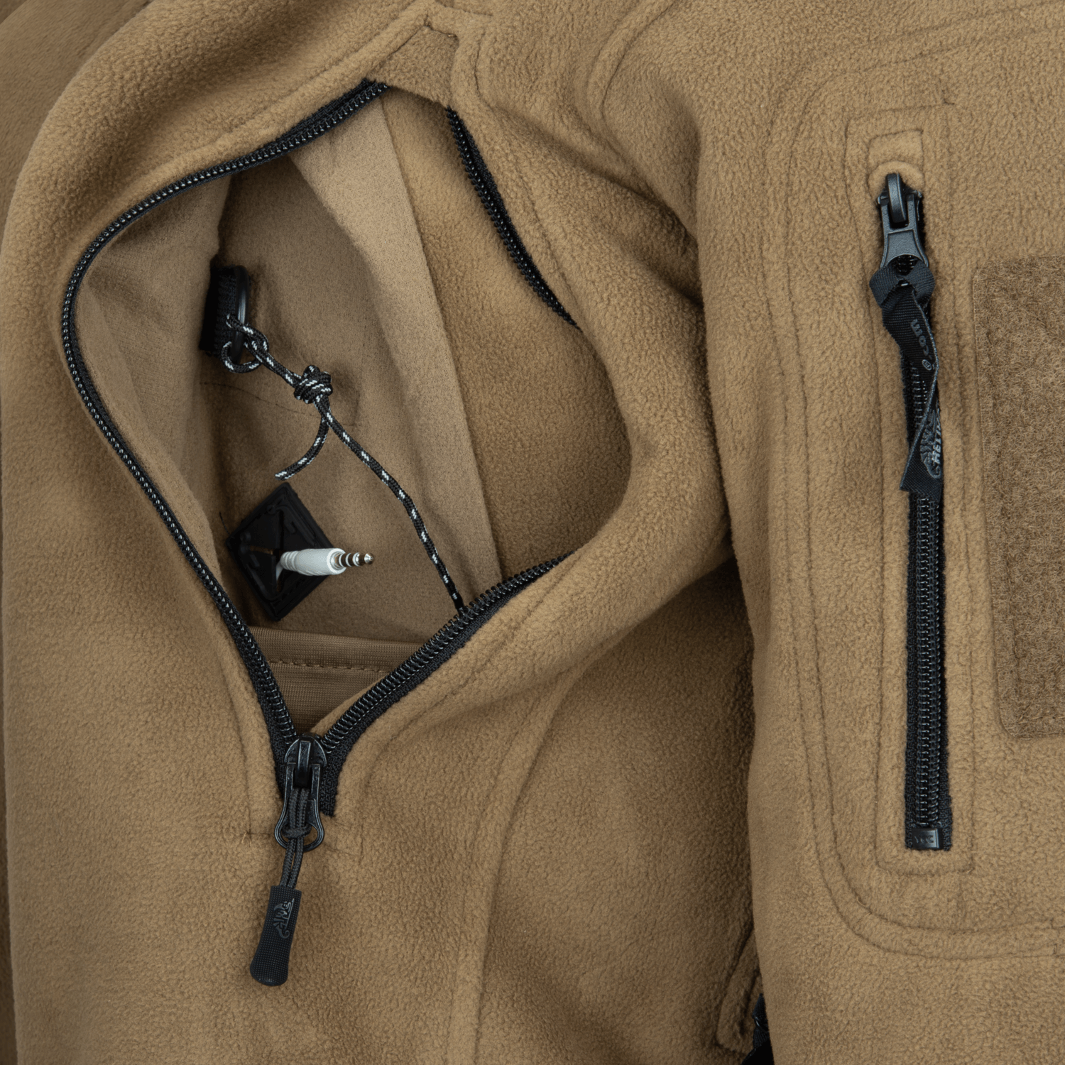 - Boczne kieszenie piersiowe zapinane na suwak z przepustami na okablowanie, D-Ringami i przegródkami na urządzenia elektroniczne