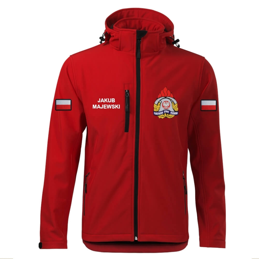Czerwona Kurtka Softshell Strażacki Personalizacja Termotransfer DTF Membrana Kaptur
