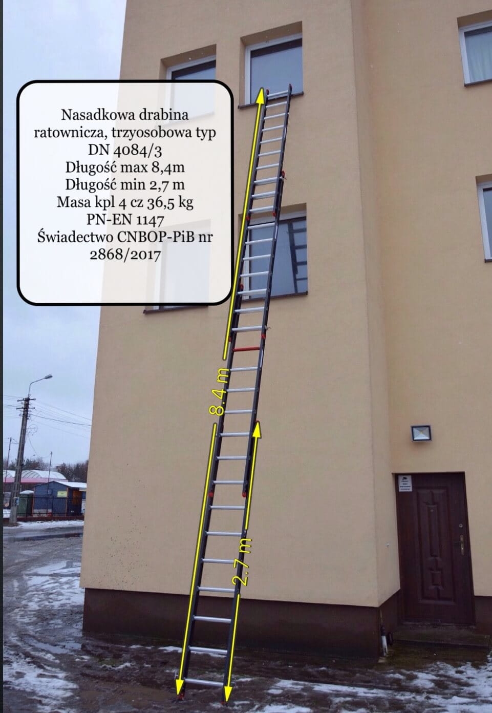 Trzyosobowa drabina czteroczęściowa, nasadkowa typ DN 4084/3 ( DN 2,7) Drabinę składa się w pozycji leżącej i stawia w całej długości. Przęsła drabiny zaopatrzone zostały w stopy antypoślizgowe, górne i środkowe przęsła w lekkie stopki z tworzywa, a dolne przęsło w masywne, stalowe stopy. Bocznice drabiny, wykonane z wysokogatunkowego stopu aluminium, o profilu dwuteowym, mają kolor czarny co w przypadku używania drabiny w zimie ma istotne znaczenie, ponieważ są one “cieplejsze” o ok. 40% od bocznic w kolorze aluminium. Szczeble o unikalnym przekroju w kształcie litery D wskazują prawidłowy kąt ustawienia drabiny oraz dają bezpieczną, poziomą, antypoślizgową, płaszczyznę do stania o szerokości 45mm. Otwarty, dwuteowy profil bocznicy oraz opatentowany system mocowania szczebli stanowią o lekkości , wytrzymałości drabiny oraz umożliwiają udzielenie 10-cio letniej gwarancji na konstrukcję, zastosowane materiały i wykonanie wyrobu.
