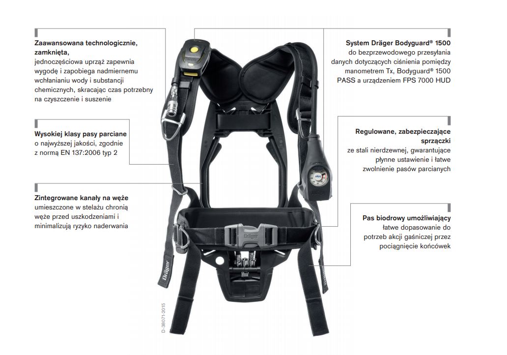 Zaawansowany system osobistego alarmu bezpieczeństwa (PASS) Dräger Bodyguard 1500 poprawia bezpieczeństwo pracy w terenie. Jednostka ochrony dróg oddechowych oraz sygnalizator bezruchu generują optyczne i akustyczne sygnały alarmowe w przypadku braku ruchu, wyczerpywania się zapasu powietrza lub skrajnie wysokiej temperatury. System wyposażony jest w bezprzewodową transmisję danych pomiędzy urządzeniem PASS, a urządzeniem monitorującym. Podświetlany manometr Tx przesyła bezprzewodowo dane dotyczące ciśnienia do urządzenia Bodyguard 1500, a także do wyświetlacza Dräger FPS 7000 Head-Up-Display, jeśli jest on używany. Funkcja ta zapewnia automatyczne powiadomienia wizualne z manometru Tx oraz akustyczne powiadomienia z urządzenia PASS, jeśli poziom dostarczanego powietrza spadnie poniżej wartości granicznych określonych przez użytkownika.