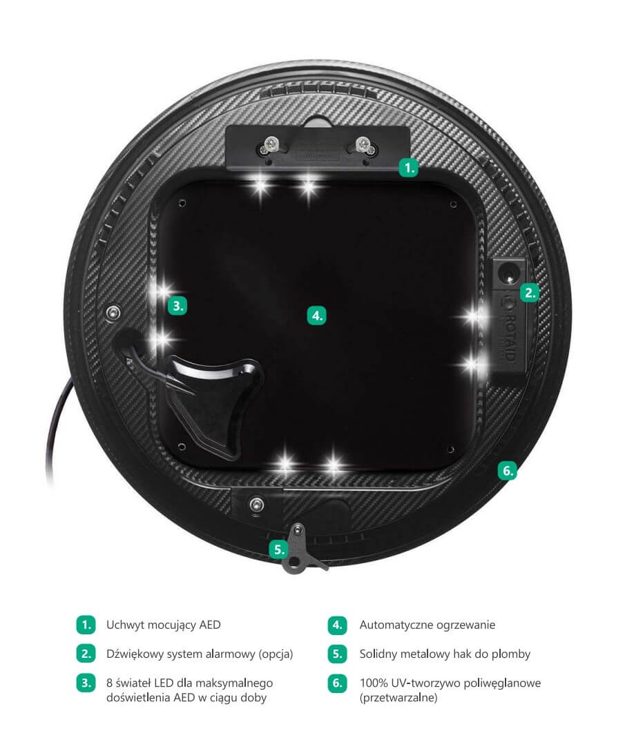 Szafka ROTAID Solid Plus Heat to innowacyjna kapsuła do przechowywania defibrylatorów AED na zewnątrz budynku. Produkt jest bardzo solidny, a jego użytkowanie proste i wygodne. Dodatkowo atutem jest niepowtarzalny wygląd, który cechuje nowoczesność i ciekawy design. Otwarcie odbywa się poprzez przekręcenie obudowy w stronę, w którą wskazują strzałki umieszczone na obudowie. Kapsuła jest wykonana z bardzo wytrzymałego poliwęglanu, który cechuje odporność na niekorzystne warunki atmosferyczne i uszkodzenia mechaniczne (certyfikat IP56). Moduł grzewczy szafki działa cały czas i uaktywnia się, gdy temperatura otoczenia spadnie poniżej 5 °C. Ponadto, szafka jest łatwo widoczna w ciemności nawet z dużej odległości, gdyż podświetlają ją taśmy LED. Wskazany model oferowany jest bez alarmu dźwiękowego. Uwaga! Działanie szafki wymaga podłączenia do stałego źródła prądu elektrycznego.