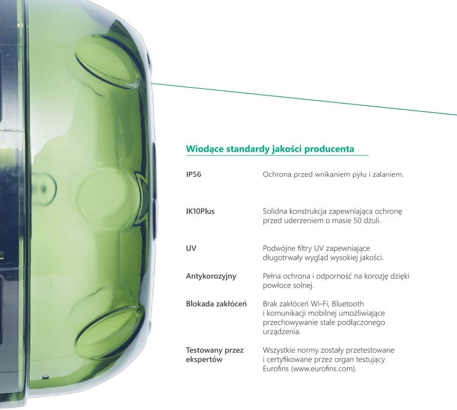 - certyfikat wytrzymałości na poziomie IP56,