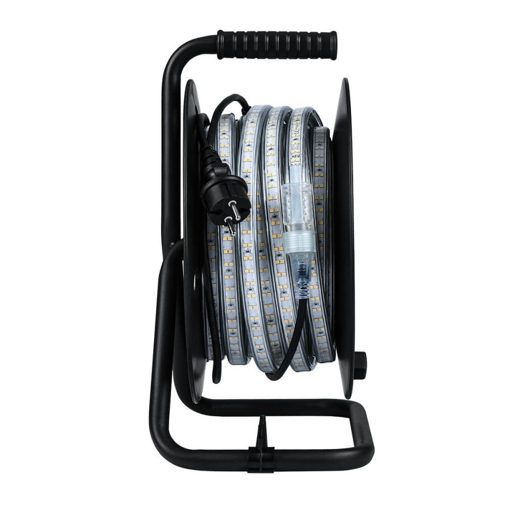 Wąż świetlny nawinięty na ręcznie zwijaną szpulę, co ułatwia transport i przechowywanie oraz pozwala na szybkie rozłożenie w dowolnym miejscu pracy.