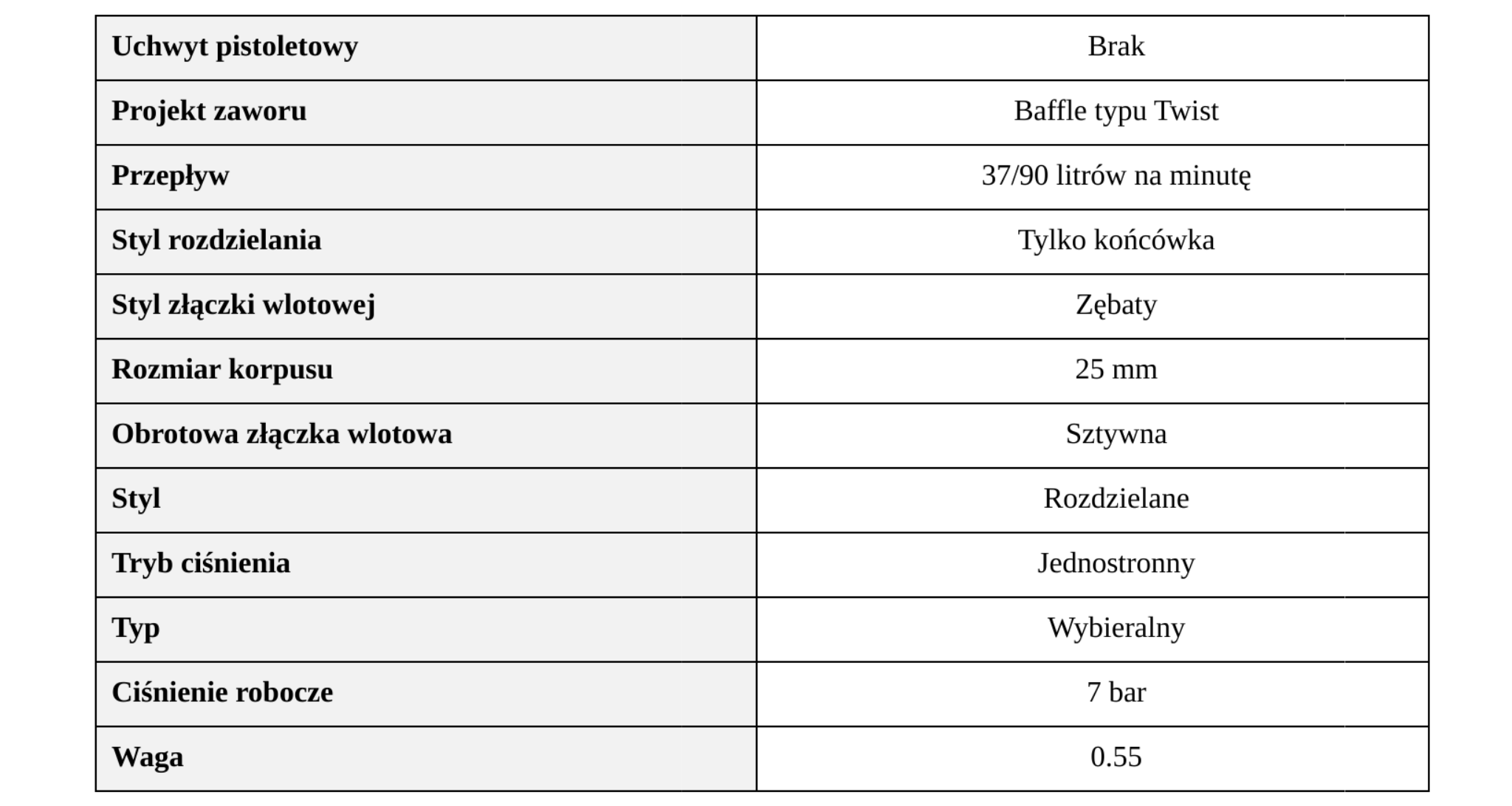 w postaci strumienia prostego oraz wysoki przepływ w postaci mgły. Taka różnorodność pozwala na optymalne dostosowanie dyszy