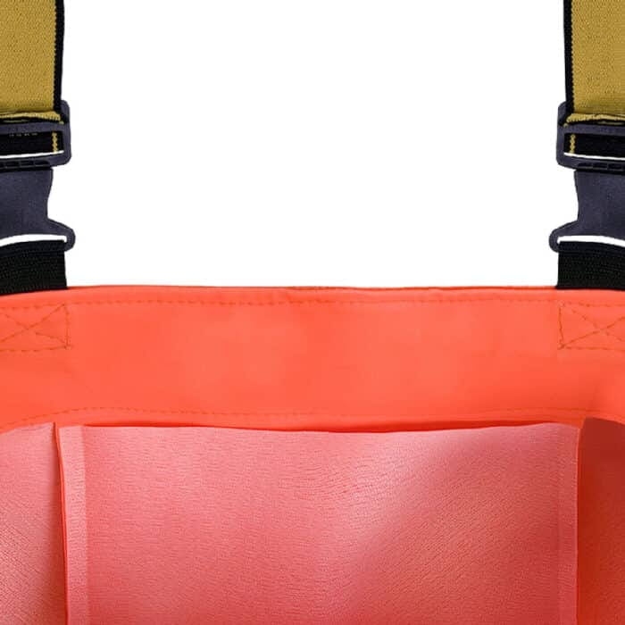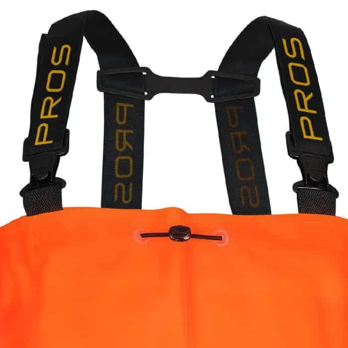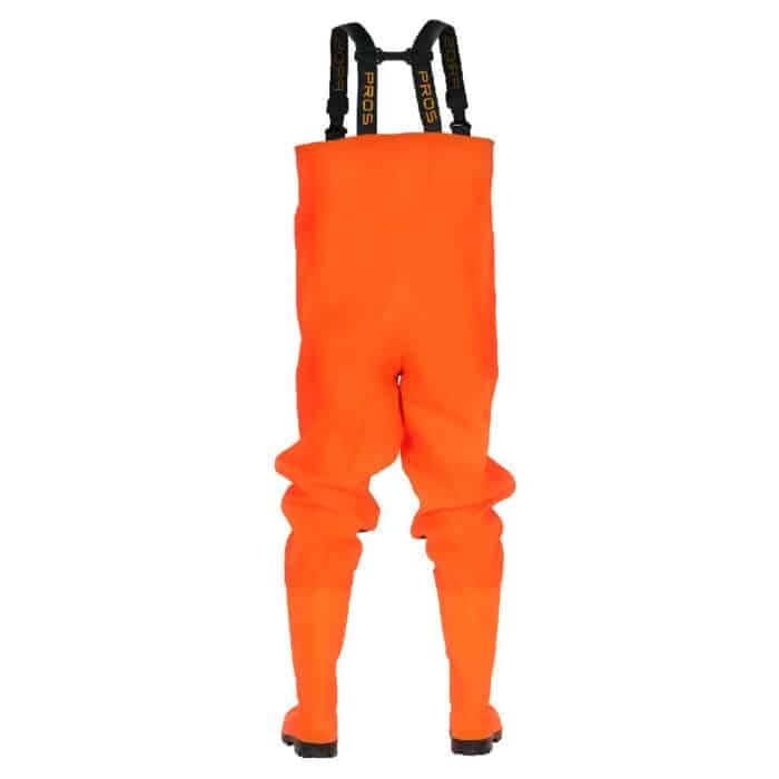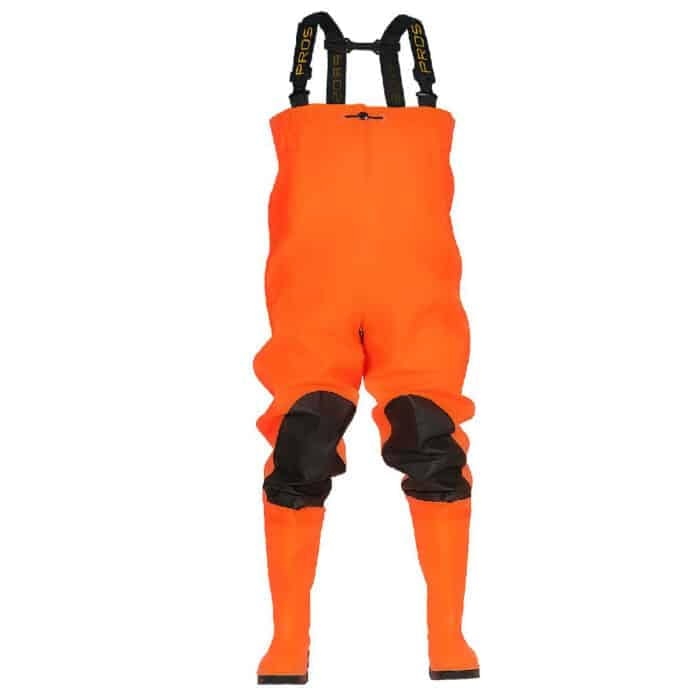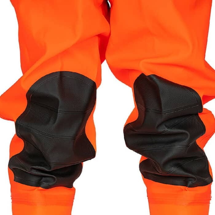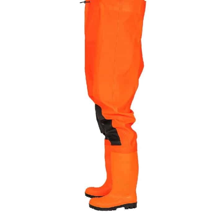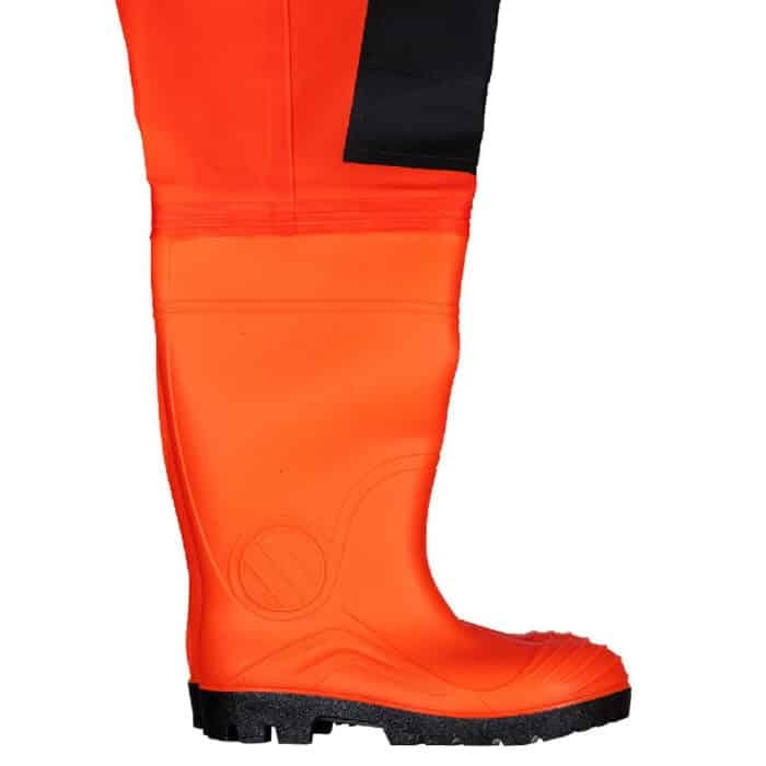 Spodnie wodochronne, z wgrzanymi na stałe, wysokiej jakości kaloszami, charakteryzujące się podwyższoną odpornością na uszkodzenia mechaniczne. W tym celu zastosowano dodatkowe wzmocnienia na kolanach. Bezpieczeństwo stóp zwiększa specjalna wkładka chroniąca podeszwę przed przebiciem oraz nosek osłaniający palce. Wykonane z materiału w kolorze fluo zapewniającym lepszą widzialność. Użytkownicy docenią możliwość regulacji obwodu, jak również wewnętrzną kieszeń.