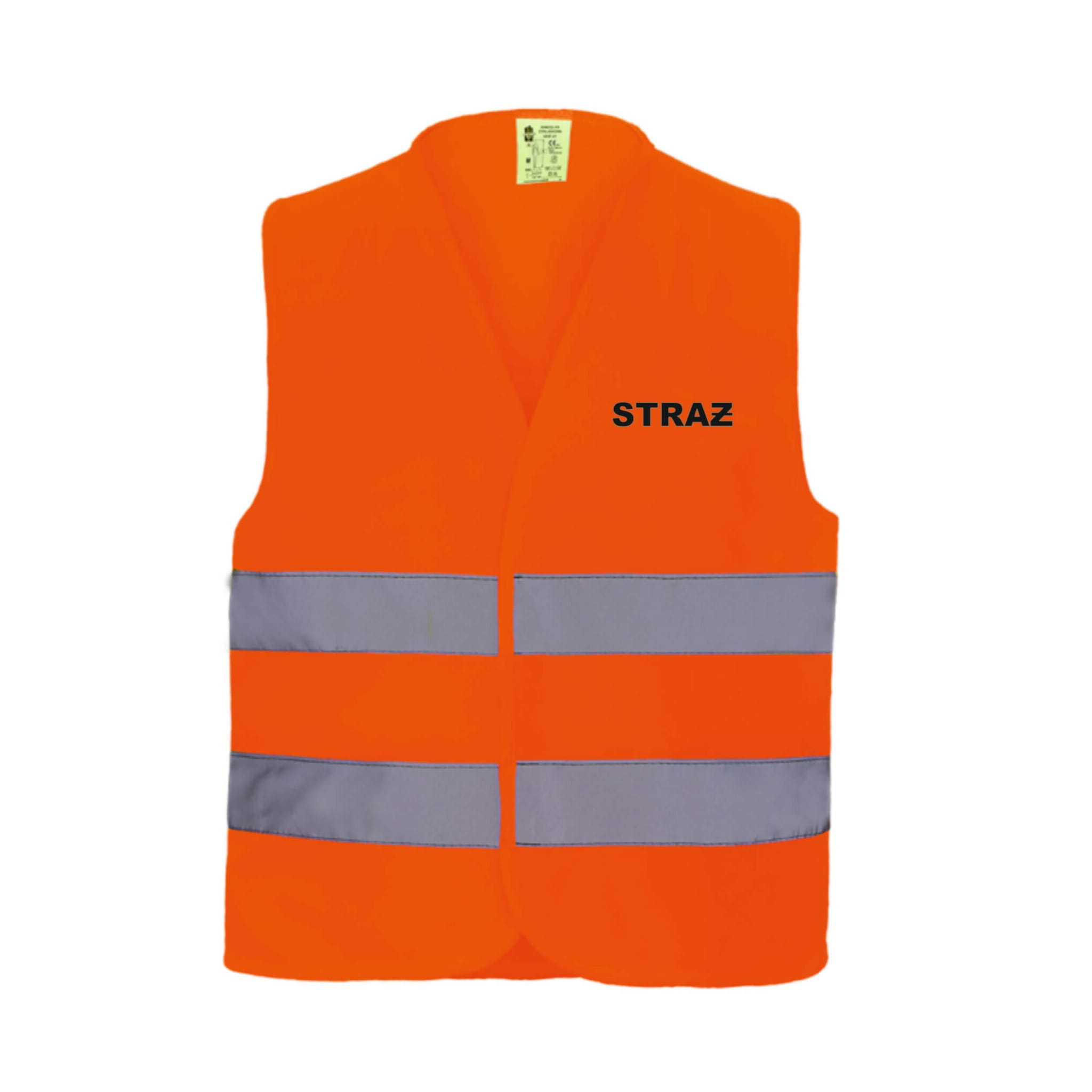 Kamizelka ostrzegawcza wykonana z wysokiej jakości poliestrowej dzianiny w kolorze pomarańczowym fluorescencyjnym z dwoma pasami odblaskowymi, zapinana z przodu na rzep.