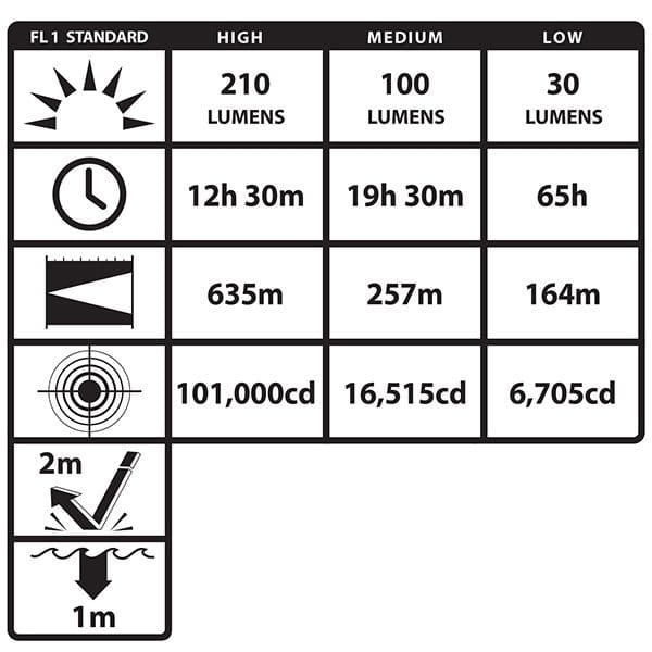 Dioda światła strumienia skupionego ma 3 tryby mocy – wysoki, średni oraz niski – 210, 100 oraz 30 lumenów a jej zasięg wynosi 635 m. Światło skupione idealnie nadaje się do pracy w zadymieniu oraz podczas poszukiwań, a także oświetlania obiektów znacznie oddalonych.