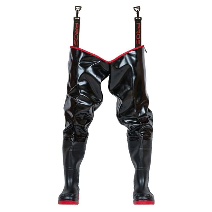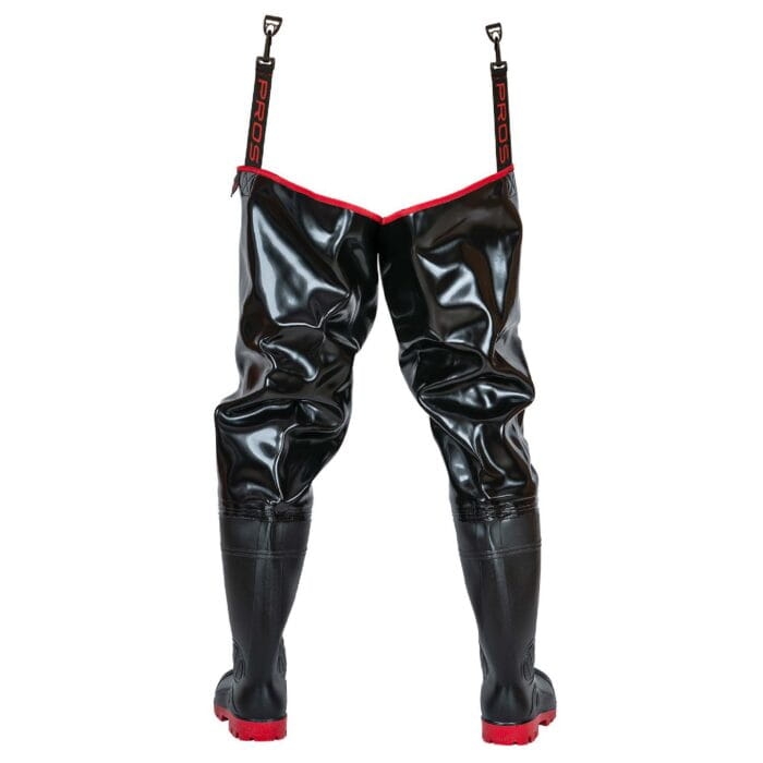 Wodery w kolorze czarnym o podwyższonej odporności na uszkodzenia mechaniczne. Wykonane z wodoochronnego, wytrzymałego materiału, zapewniającego skuteczną ochronę nóg przed wilgocią, zgrzanego na stałe z kaloszami antypoślizgowymi. Wyposażone w wygodne, gumowe mocowania podtrzymujące.