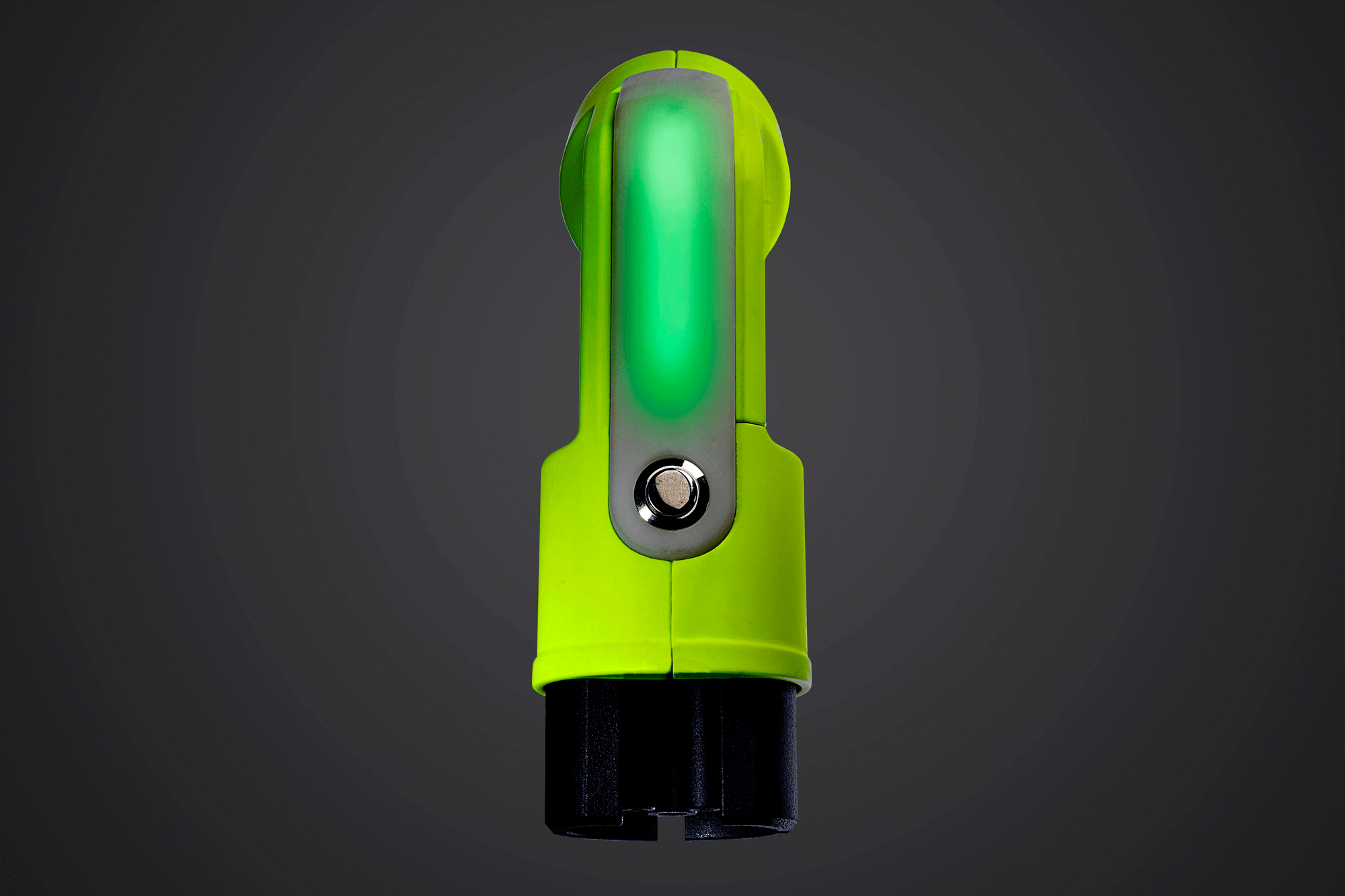 - Wtyczka awaryjna jest wyposażona w autotest. Po naciśnięciu przycisku można sprawdzić czy oprogramowanie wtyczki awaryjnej działa poprawnie przed podłączeniem. Po prawidłowym działaniu świecąca krawędź wtyczki awaryjnej zaświeci się na zielono i jest gotowa do użycia.