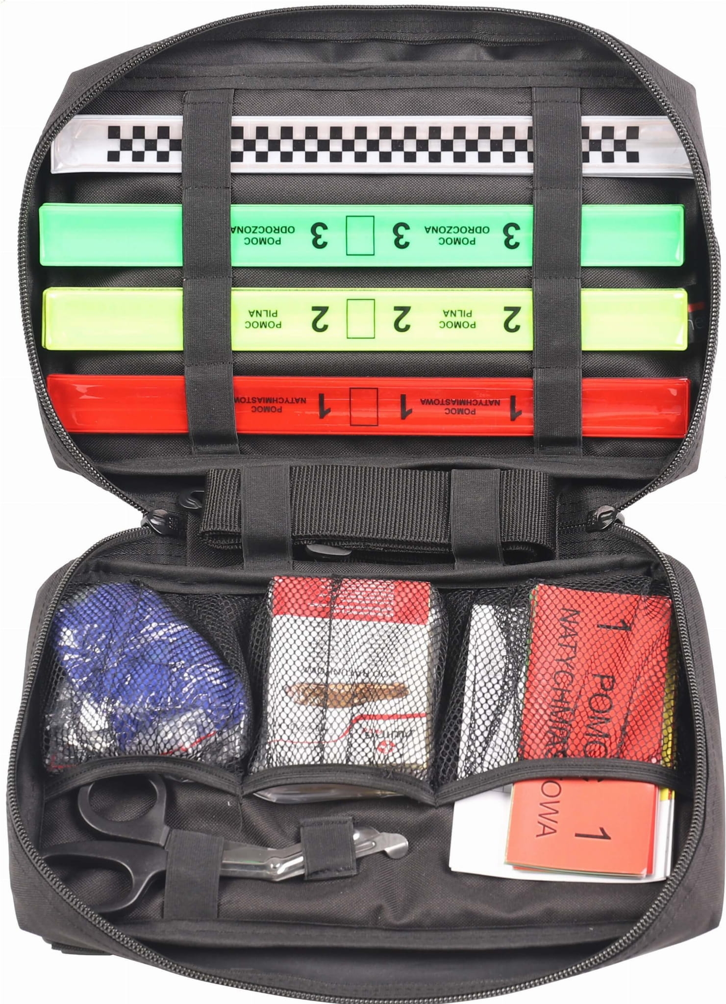 Zestaw TRIAGE do segregacji poszkodowanych na miejscu zdarzenia masowego. Wyposażenie pozwala na szybką selekcję poszkodowanych podczas wypadków masowych. Komplet umieszczony w bardzo poręcznej torbie wykonanej z wytrzymałej tkaniny poliestrowej (CODURY). Po otwarciu zamka błyskawicznego, użytkownik ma bezproblemowy dostęp do całego wyposażeniu. Torbę można nosić zarówno w ręku za pomocą wygodnego uchwytu lub na ramieniu na pasku. Ponadto, torba wyposażona w system MOLLE, który umożliwia doczepienie torby triage do innych produktów.